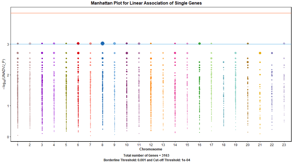 PLINK –linear command combined with –set-test command can be used to perform this analysis. Figure 13. shows a Manhattan plot for the results where the diameter of the points represents the number of significant SNPs within the boundaries of the associated gene. Table 2. shows that gene BAALC appears among the top list of genes which is consistent with the single marker analysis result. Other genes appeared such MAP3K5 and SAXO1 which worth further investigations. But remember that, this phenotype is simulated and doesn’t reflect a real trait.