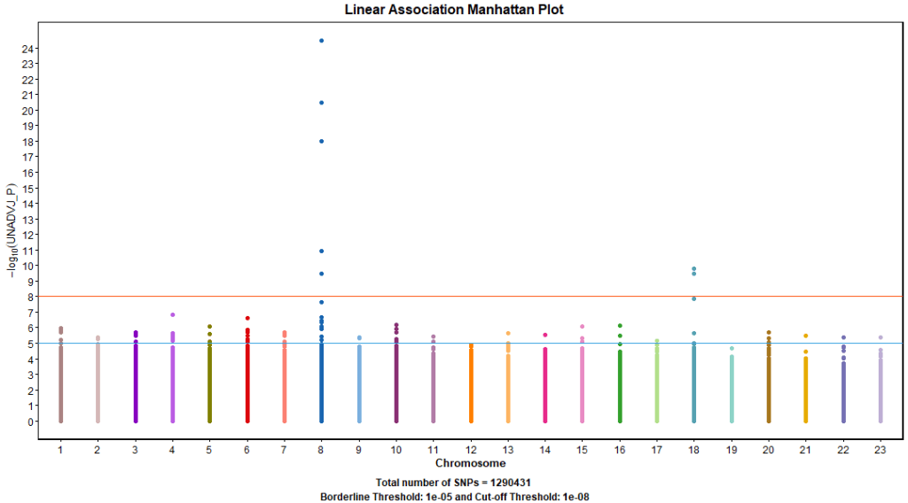 PLINK –linear command used linear models to test the association with our simulated phenotype. Figure 11. shows 2 signals; one on chromosome 8 (5 SNPs) and the other on chromosome 18 (2 SNPs). Table 1. shows more detailed information about significant SNPs and their closest genes.