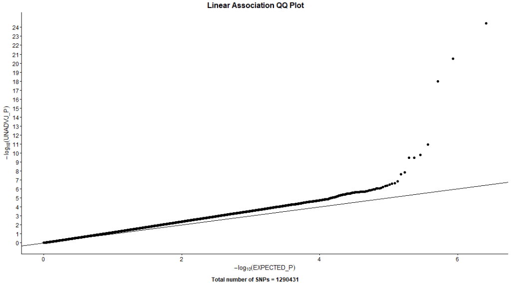 PLINK –hardy command generates p-values as an output of equilibrium exact test measuring the deviation from the distribution null hypothesis. We use p-value cut-off threshold of 1e-06. Figure 10. shows no SNPs deviated significantly from the null hypothesis.
