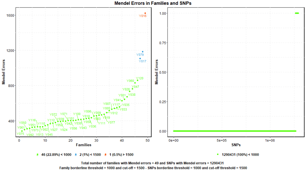 Mendel errors counts alleles in individual samples that don’t conform to the principles of Mendelian inheritance. This test requires accurate family/trio data. A small number of Mendel errors exists within each family, however, when the number exceeds a certain threshold, this indicates a genotyping error or inaccurate family data.