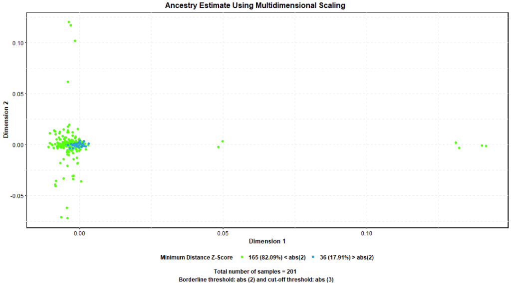 Ancestry is the study of a given population structure, it refers to genetic differences that exist between individuals from different families, groups, or geographical regions. Ancestry could be estimated and understood using multidimensional scaling (MDS) and calculation of nearest neighbor distances between samples.