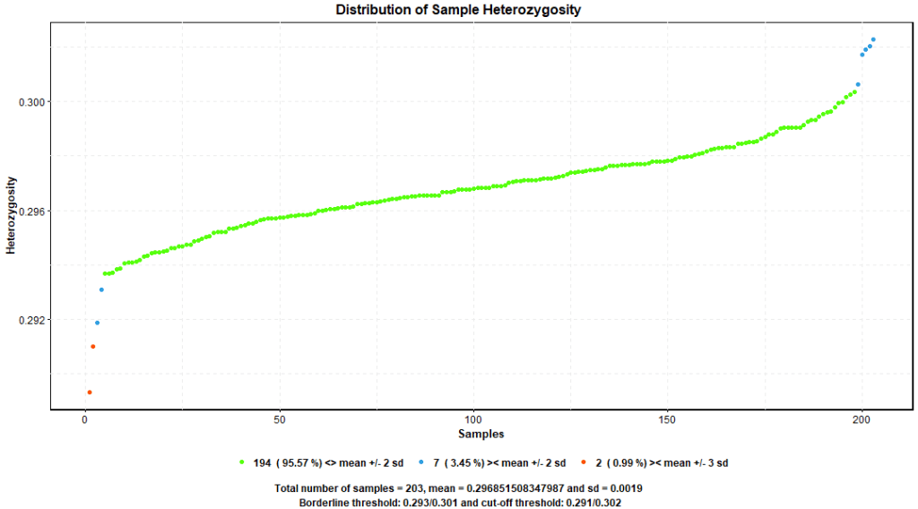 Heterozygosity is the proportion of heterozygote genotypes in relation to all genotypes, it is a common practice to evaluate heterozygosity on samples. Essentially, if a sample’s heterozygosity is high, it can be an indicator of DNA contamination or a sign of true deviation of that sample from the bulk of data samples. Removal of samples that depart 3 standard deviations (+/- 3SD) from the mean is a reasonable approach to ensure sample consistency.