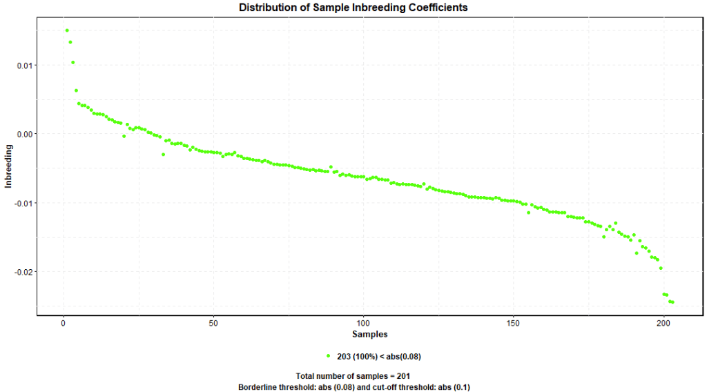 Probability theory is utilized to assess inbreeding; the inbreeding coefficient (F), also called fixation index, is the probability that both alleles in one genomic locus are identical and derived from the same ancestral allele – identical by decent (IBD). Excessive inbreeding leads to a decreased biological fitness of the affected population; genome wide association analysis assumes a population with normal biological fitness; therefore, it’s highly desirable to exclude samples with inbreeding coefficient less than -0.1 or greater than 0.1. Generally, the average inbreeding coefficient for all the samples should be around zero.