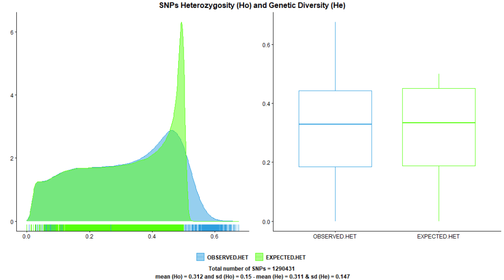 PLINK –hardy command produces both of these statistics, SNPs expected and observed heterozygosity. Figure 3. shows approximately equal heterozygosity and genetic diversity statistics after applying the previous quality control steps, an indicator that we are heading in the right direction.